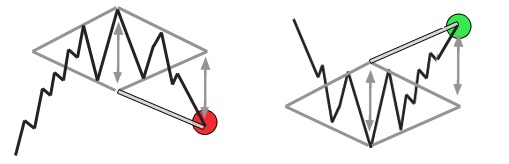Afterwards, there is a support breakdown followed by the upturn or resistance breakdown followed by the downfall. Fluctuations may exceed the rhombus bounds, but after a short period of time, relatively to the period of a diamond formation, there will be a spike and a trend change. It is better to enter the market when the pattern is already formed (the price on the chart is making either uptick or downtick breakdown).