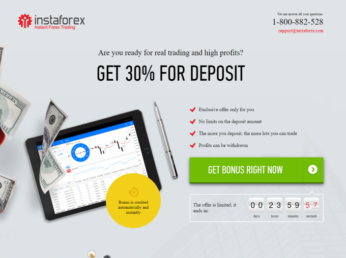 仅限InstaForex客户的有利优惠。为您的交易账户充值并获得存款额+30%。较高的存款额可以提供进行更大交易量的机会。对任何存款,奖金都会立即提供,无上限。