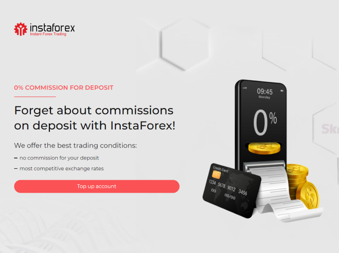 InstaForex提供最有利的汇率,并且存款不收取任何手续费。无论客户使用何种交易方式——存入金额会全额记入交易账户,不收取任何费用。